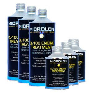 Microlon CL-100 Aircraft Engine Treatment was developed primarily for use in the aviation market and has been successfully used for over three decades to treat high performance piston aircraft engines. It is the first engine metal treatment to pass the rigorous tests necessary for FAA approval (May 1979). It is designed for use in aircraft engines of up to 1000 cubic inch displacement.
